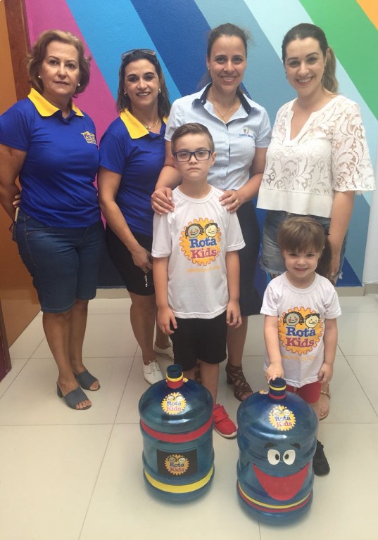 A entrega pelo presidente do Rotakids João Pedro Quaglio Meurer e sua irmã, Clara Meurer. Junto deles a Rotariana Daiane Meurer, a Coordenadora regional da ASR Andréia Martinez e a presidente da ASR Lu.